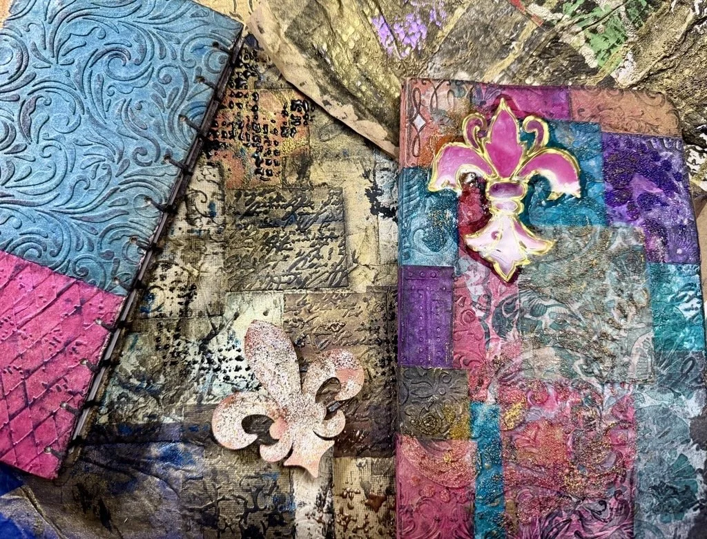The second class in the series involves creating a cover for our book. We will be using the paper with made in session one along with other paper and paper from you stash. The cover will consist of layering techniques. We will combine paper, mediums, ephemera, inks, and embellishments. Build a removable cover for and existing book, add a simple sewn, or continue in the third class in the series to put in all together in a Coptic bound book.