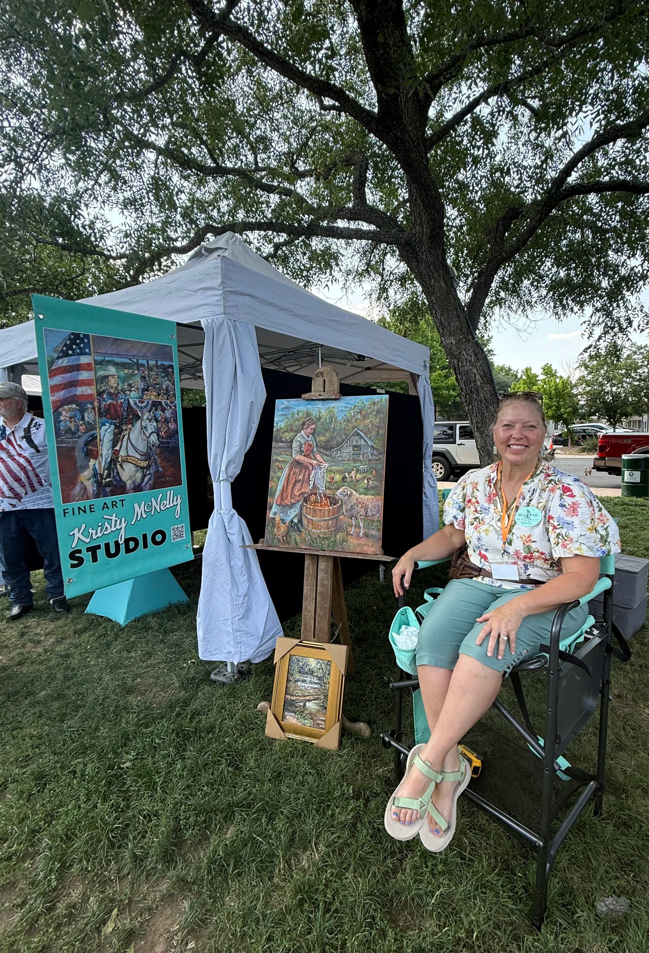 Born on a farm in Fremont, Michigan, Kristy McNelly’s early days were spent riding horses and playing in the woods along the creek. Art has been a long pastime since childhood. It is that love for nature and animals that is still carried into her work today as an oil painting artist. An active volunteer and director of the AgriCultural Museum and Arts Center in Boerne, Texas, Kristy enjoys putting on events and antique tractor pulls. She can also be seen on back roads around Texas driving her seafoam green antique 1950 Ford Truck called “Seabiscuit”. Kristy graduated from Michigan State University with both an art and geography degree before moving to Bergheim, Texas where she resides on a ranchette with her husband, Chuck. Kristy invented and patented a urethane plastic horseshoe called Ground Control Horseshoes in 1999, which she sells worldwide. As a graphic designer, Kristy has owned her own business, Polonyx, for over three decades. All through the years, Kristy has continued to oil paint, showing and selling her art and taking art workshops to further her skills. She is a member of Oil Painters of America, Cowgirl Artists of America, American Impressionist Society, Boerne Visual Artists, American Women Artists, American Plains Artists, and Key West Art Center & Gallery.